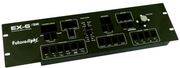 Für 4 DMX-Geräte mit je bis zu 6 Steuerkanälen. 32 frei programmierbare Chaser mit bis zu 32 Schritten. Joystick für manuelle Bewegung des Ablenkspiegels